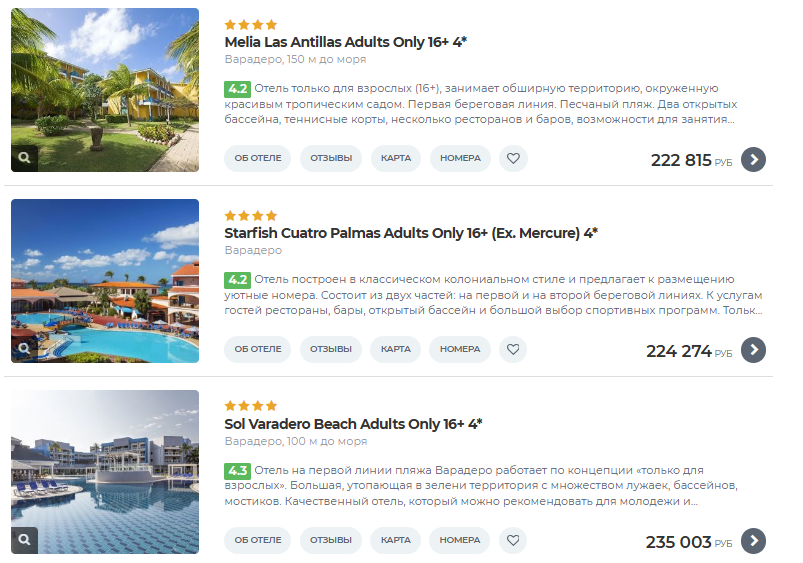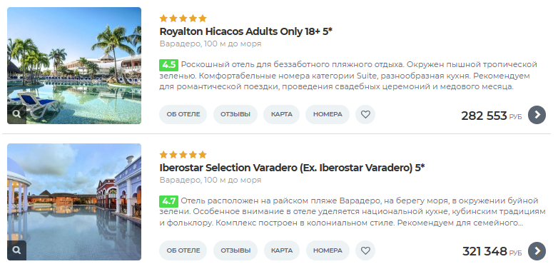 Недельный отдых в Варадеро, например в декабре, начинается от 222 000 рублей за двоих, в отеле категории четыре звезды. В стоимость входит международный авиаперелет из Москвы, трансфер, страховка, проживание и питание по системе «Все Включено».